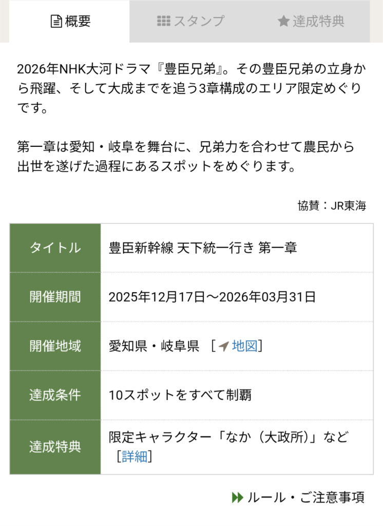 今回のイベントは私は勘違いしてて新幹線に乗らないとダメなイベントかと思ってましたが、新幹線イベントと通常のエリア限定めぐりイベントの2本立てのようだ。