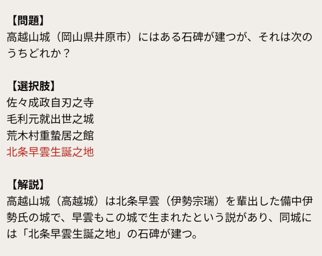 高越山城(岡山県井原市)にはある石碑が建つが、それは次のうちどれか?