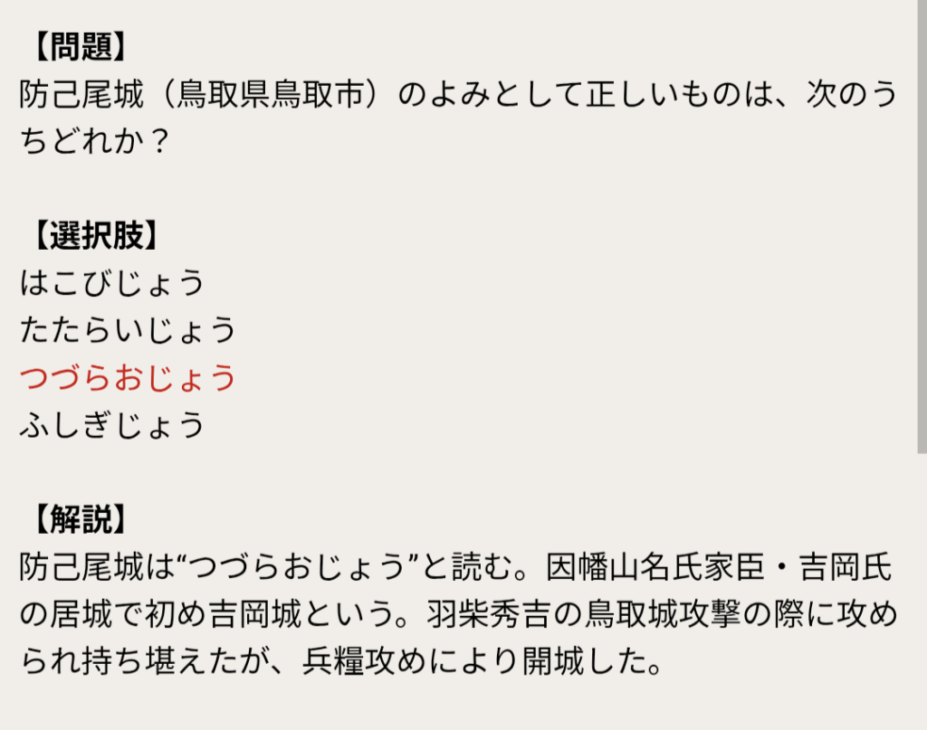 歴史クイズ 防己尾城(鳥取県鳥取市)のよみとして正しいものは、次のうちどれか? Byこじ助 2026-01-152026-01-15 ・はこびじょう・たたらいじょう・つづらおじょう・ふしぎじょう ↓ ↓ 答え ↓ ↓