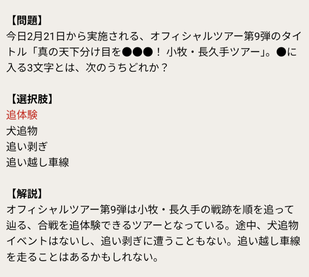 今日2月21日から実施される、オフィシャルツアー第9弾のタイトル「真の天下分け目を●●●! 小牧・長久手ツアー」。●に入る3文字とは、次のうちどれか?