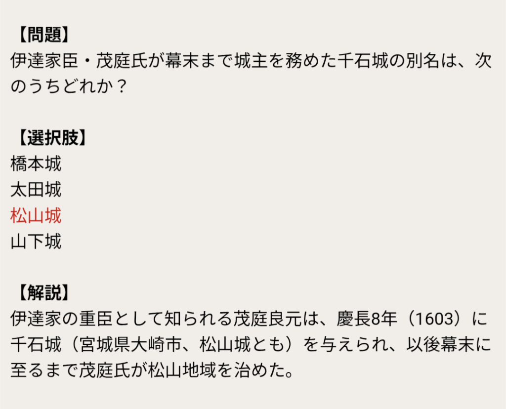 伊達家臣・茂庭氏が幕末まで城主を務めた千石城の別名は、次のうちどれか?