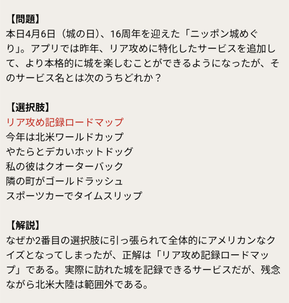 本日4月6日(城の日)、16周年を迎えた「ニッポン城めぐり」。アプリでは昨年、リア攻めに特化したサービスを追加して、より本格的に城を楽しむことができるようになったが、そのサービス名とは次のうちどれか?